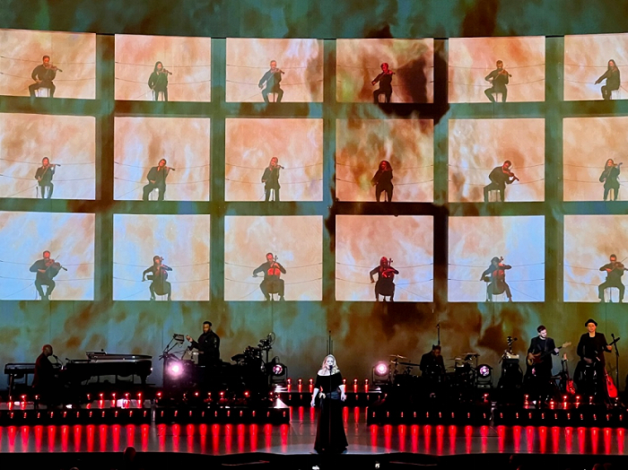 最令人印象深刻的,莫过于当阿黛尔表演《Set Fire to the Rain》的副歌时,几层楼高的雨帘前的钢琴上真的窜出火焰,火光在地板的反射下格外壮烈。当后方屏幕照亮时,我们还能看到脚手架上的24名乐手的黑影在火光里演奏着。