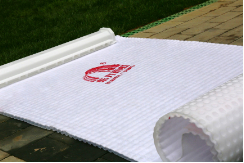 同时,系统采用高性能环保胶粘剂与丙纶短纤土工布复合,复合强度高,应对回填土承压均匀。而丙纶短纤土工布克重不低于250g/㎡*,渗水效果优异,阻隔性强,耐酸碱性腐蚀,具有广泛的土壤适应性,有效杜绝了市面上传统排水板和土工布分离式结构铺设难度大,排水板掺杂回料自身强度差,覆土后塌陷等问题。