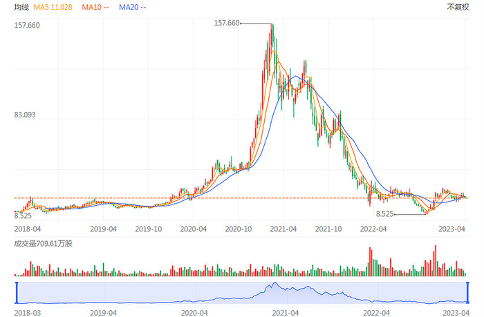 股价最高157.66美元,而到4月4日收盘时是21.66美元。