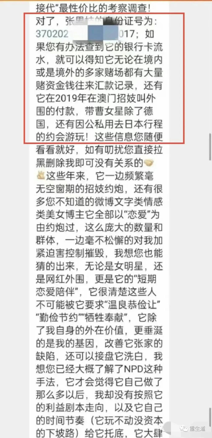 此人知道张继科的身份证,呼吁查阅一下张继科的银行卡流水账,称他在境内外的多家赌场都有汇款记录,2019年张继科还曾在澳门招妓,叫了一个外围女。