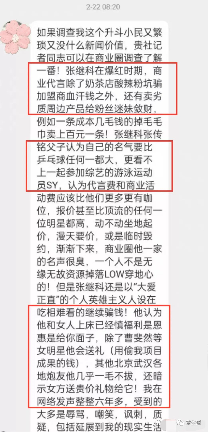 爆料者说,张继科非常狂妄自大,觉得他和女人上床睡觉,是对女性的恩惠、施舍,对全国各地的P友都非常抠门,从来不会送女性礼,甚至会暗示对方给他买昂贵的礼物。