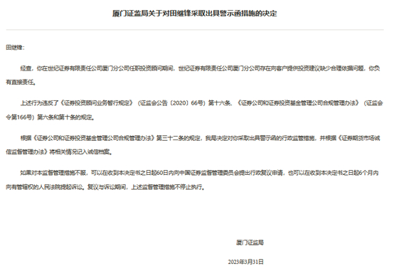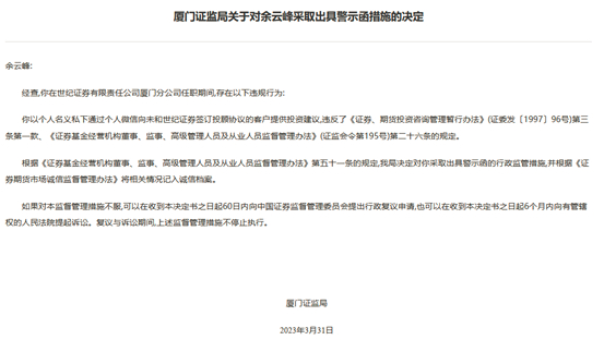 两名任职人员也相继由于不同的违规原因被出具了警示函,并根据《证券期货市场诚信监督管理办法》被证监局将相关情况记入诚信档案。经查,员工余云峰以个人名义私下通过个人微信向未和世纪证券签订投顾协议的客户提供投资建议,投资顾问田继锋对世纪证券厦门分公司向客户提供投资建议缺少合理依据问题负有直接责任。
