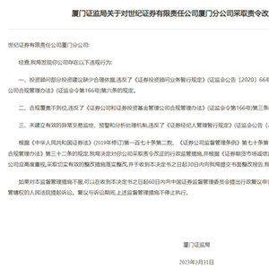 4月4日,厦门证监局一次性挂出三张罚单,对世纪证券厦门分公司和其任职人员做出处分。从被罚事由看,三张罚单之间直接存在高度关联。世纪证券厦门分公司被采取责令改正的措施,其两名员工被出具警示函。