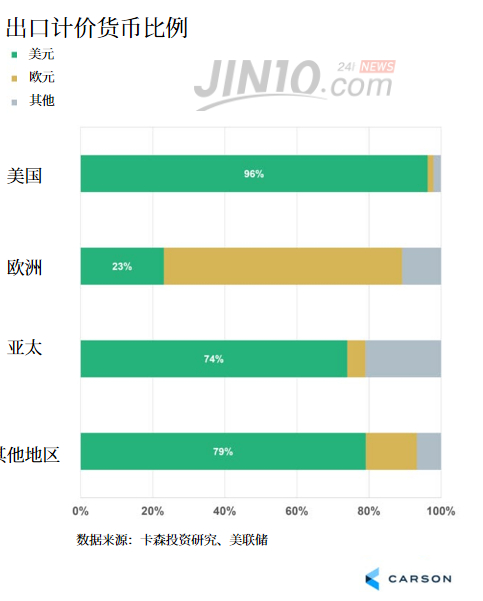 美元是国际贸易中最受欢迎的结算货币,甚至在北美和南美以外的地区亦是如此。除了欧元地区外,国际上超过70%的出口是以美元计价的。