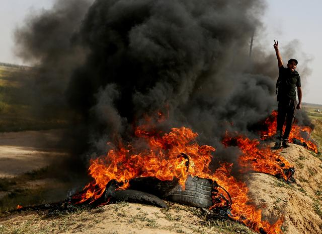 当地时间2023年4月5日,巴勒斯坦加沙地带南部汗尤尼斯以东,巴勒斯坦人沿着与以色列的隔离围栏燃烧轮胎,抗议以色列对阿克萨清真寺的猛攻。视觉中国 图