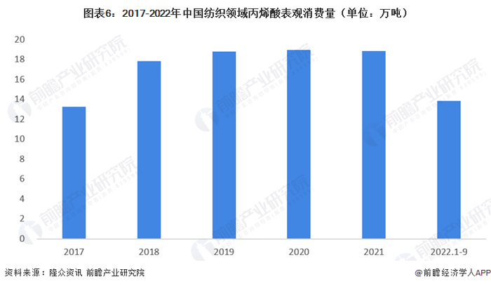 隆众资讯数据表明,我国纺织领域约占丙烯酸酯下游市场应用的11%,而丙烯酸酯约占丙烯酸下游的60%,据此比例测算,2021年我国纺织领域丙烯酸表观消费量约为18.9万吨。