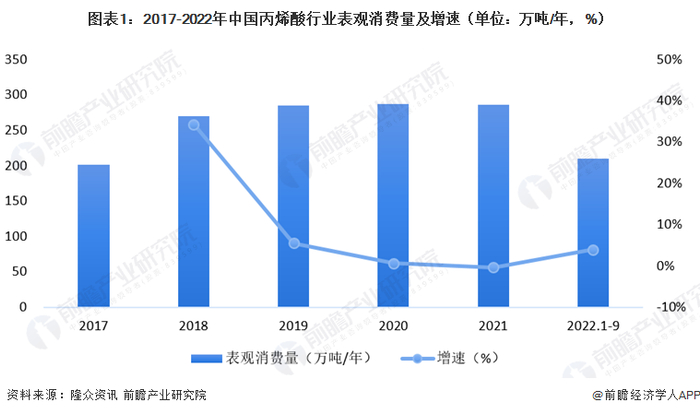 丙烯酸下游广泛应用于个人护理产品、有机化学品、表面活性剂、胶粘剂、纺织品、水处理等各个领域,在汽车中主要是用于各部位的粘接以提升生产效率,保护车身。2017-2021年,我国丙烯酸表观消费量不断增加,呈上升趋势。受疫情的影响,2020年丙烯酸市场销量同比有所下滑。2021年我国丙烯酸表观消费量为286万吨,自2017年以来年均复合增速分别为7.92%。初步核算,2022前三季度表观消费量在210万吨,同比增长4%。