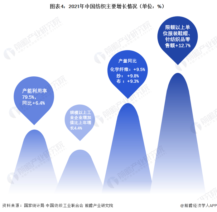根据国家统计局数据,2021年,我国纺织业、化纤业的产能利用率分别为79.5%、84.5%,较2020年分别提高了6.4个和4.0个百分点。从主要产品产量来看,2021年,大部分产品产量均有不同幅度的增长。