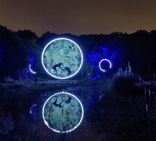 位于九棵树未来艺术中心北面,游览路线总长约1.5公里。以《山海经》和阴阳五行为灵感,通过顶尖的数字多媒体和互动装置技术,以林地本身的自然风貌为依托,把夜色里的森林公园变成旭林秘境融入奉贤地方文化风情,实现了林间经济的绿色发展路径,探索了以林养林的可持续发展模式。