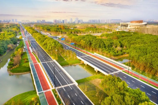位于奉贤区中央生态林地片区,是奉贤新城重点生态资源环境保护区,保留了原先路上200多棵较大的树木,配以绿化景观、驳岸景观,成为真正意义上的“森林大道”。其中非机动车道和人行道分别采用红色、绿色彩色沥青,宛如腰带,系于绿林。