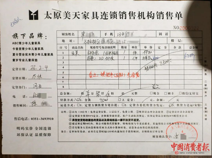 3月20日,山西省太原市消费者申先生向《中国消费者报》记者反映,今年2月份,他到居然之家河西店二层的ABC儿童家具店购买家具。