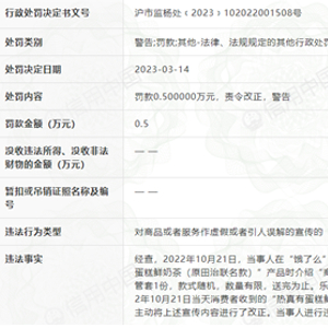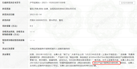 具体处罚事由为,此前,当事人在外卖平台上的“LELECHA乐乐茶(上海长宁国际店)”销售“热真有蛋糕鲜奶茶(原田治联名款)”产品时,介绍“购买原田治联名产品赠贴纸和吸管套1份,乐乐茶X原田治联名限定”等内容。对于上述宣传内容,当事人承认消费者收到的该款奶茶部分产品不是原田治联名款。