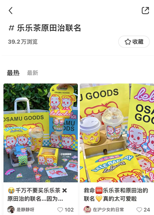 记者通过登录某社交平台发现,乐乐茶与原田治联名奶茶于2022年10月底上线。目前该款产品“真有蛋糕鲜奶茶”已经下架。截至稿件发布,#乐乐茶原田治联名#浏览量为39.2万。