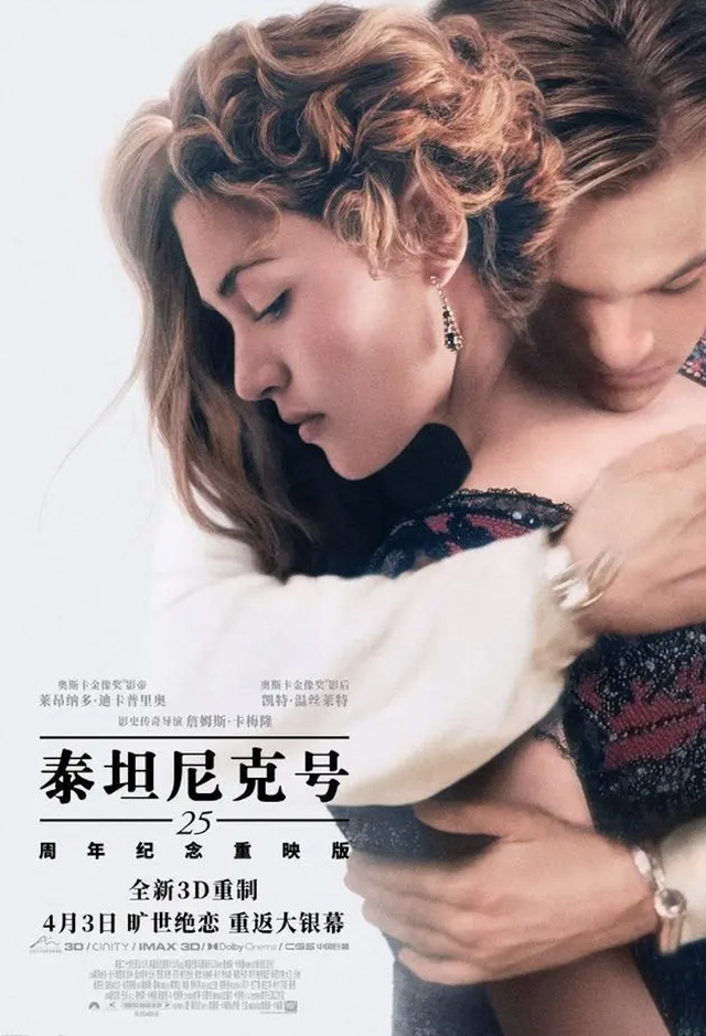 为纪念《泰坦尼克号》中国内地上映25周年,该片于今年4月3日再次上映。据悉,这次上映,以全新3D重制登陆全国艺联专线,并以CINITY/IMAX/杜比视界/中国巨幕等格式登陆中国内地各大院线。此次,影片以3D、4K、HDR、高帧率重制,试图以更完美的影像还原这场超越时间的旷世绝恋。