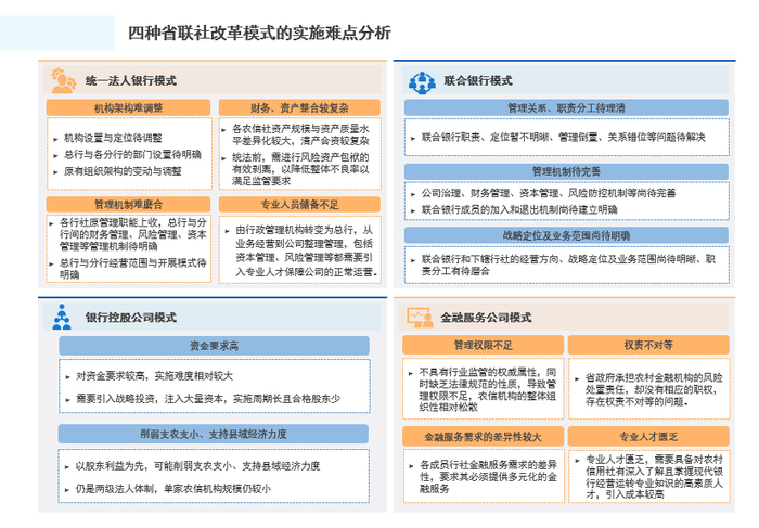 四种省联社改革模式的优势以及实施难点分析如下所示: