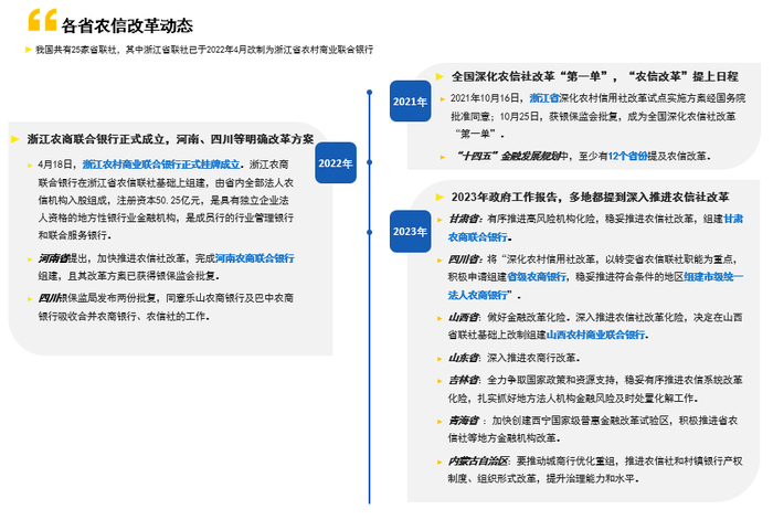 2023年,全国多省区在2023年度《政府工作报告》重点工作中都提到了深入推进农信社改革和防范化解金融风险,其中甘肃省明确提出有序推进高风险机构化险,稳妥推进农信社改革,组建甘肃农商联合银行;四川省明确深化农村信用社改革,以转变省农信联社职能为重点,积极申请组建省级农商银行,稳妥推进符合条件的地区组建市级统一法人农商银行;山西省明确在省联社基础上改制组建山西农村商业联合银行。