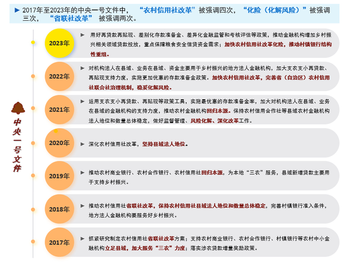 此外,从2017年起,中央一号文件就连续提出“开展省联社改革试点”“抓紧研究制定省联社改革方案”“推动农村信用社省联社改革”等要求,并在2023年的中央一号文件中,进一步强调“加快农村信用社改革化险,推动村镇银行结构性重组”的重要性。