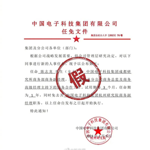 4月6日晚,据新华网报道,其从中国电科成都多家单位获悉,网上有关“中国电科陈志龙”的信息,均为虚假信息。中国电科方面称,集团公司所有单位已经开展了多轮次排查,包括劳务派遣和协作人员,均无此人,网上出现的任免文件明显伪造,相关单位已报案。