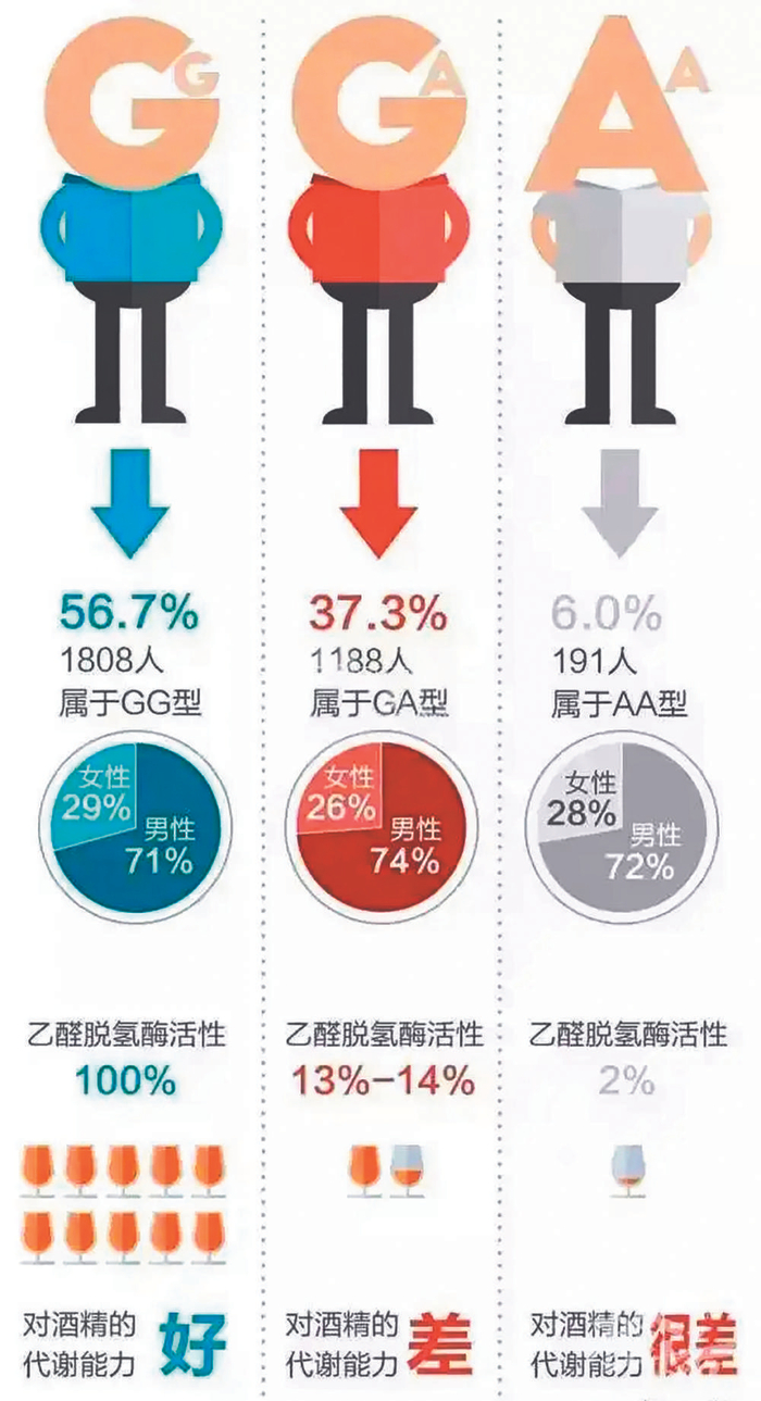 据毛根祥介绍,ALDH2基因有三种类型,即野生型(GG型、正常型,对酒精代谢能力好)、杂合突变(GA型,对酒精代谢能力差)和纯合突变(AA型,对酒精代谢能力很差)。