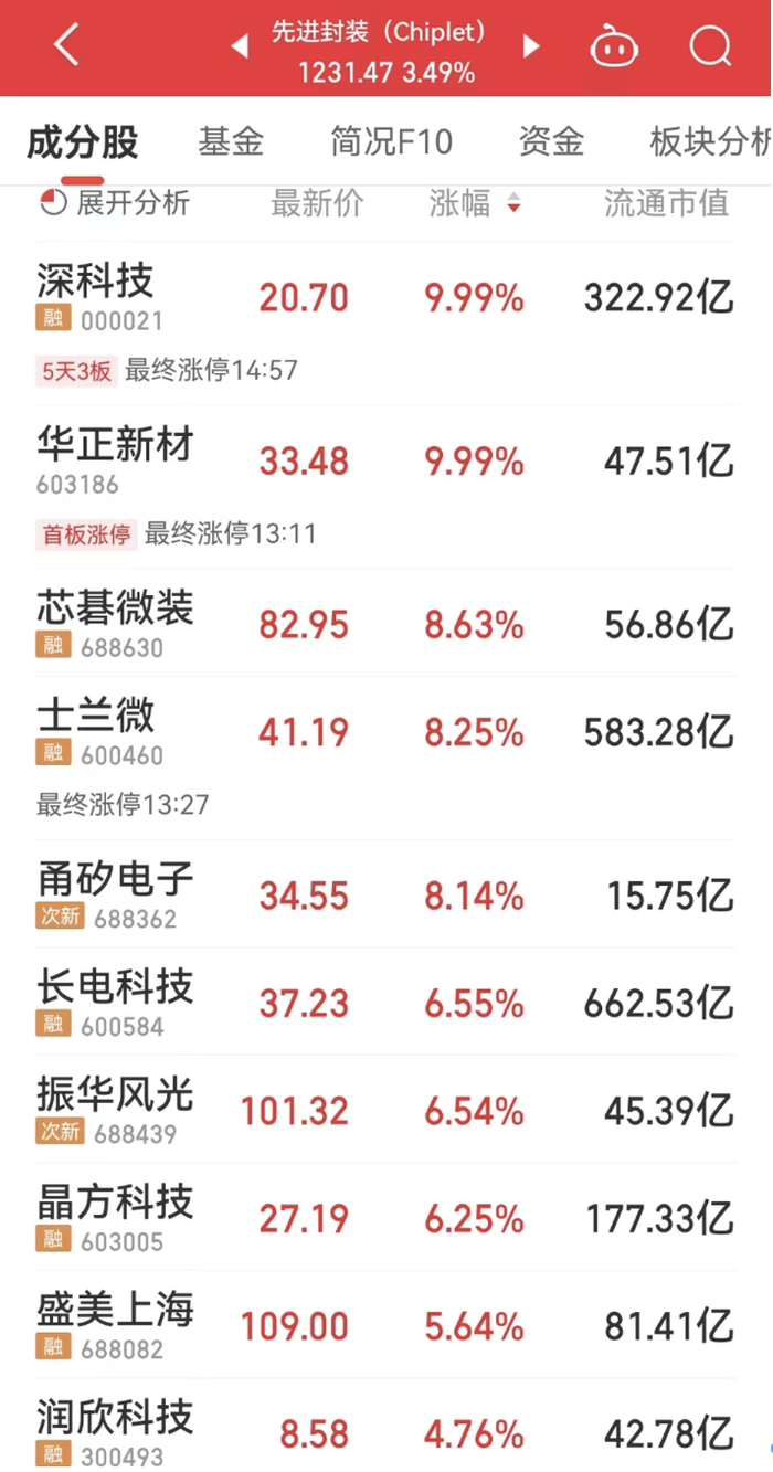 Chiplet(先进封装)概念股持续走高。截至昨日收盘,深科技5天3板,华正科技涨停,佰维存储涨超10%,芯碁微装、士兰微、甬矽电子涨超8%,长电科技、晶方科技、通富微电等跟涨。