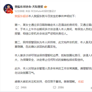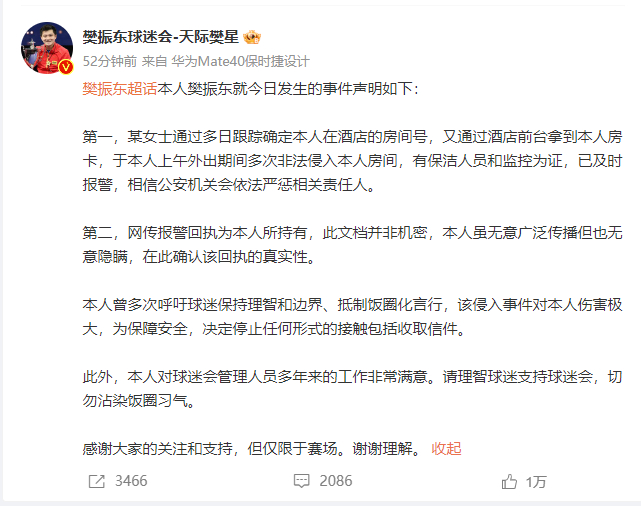 4月6日,樊振东通过@樊振东球迷会-天际樊星 发布声明,回应房间被非法入侵事件: