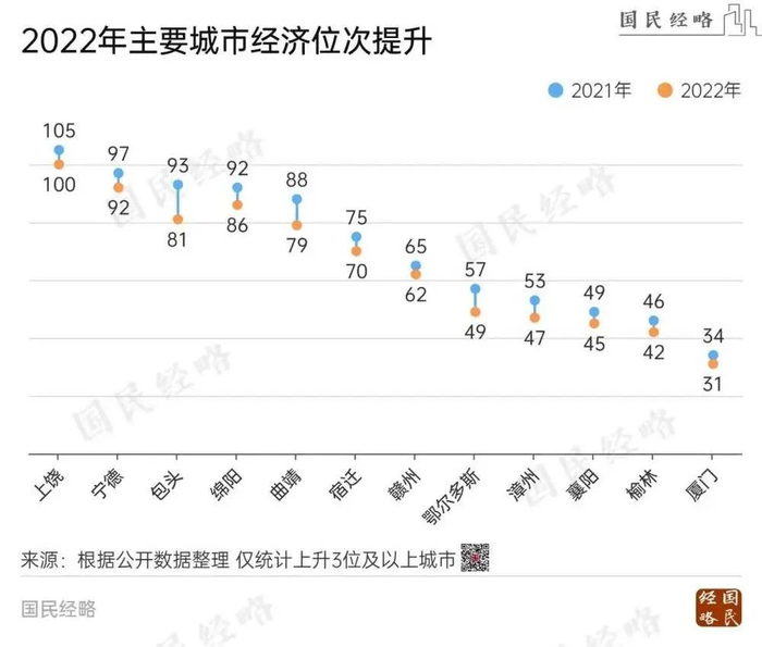 在一众城市,经济排名进步最大的当属包头、曲靖和鄂尔多斯,分别上升11位、9位和8位。