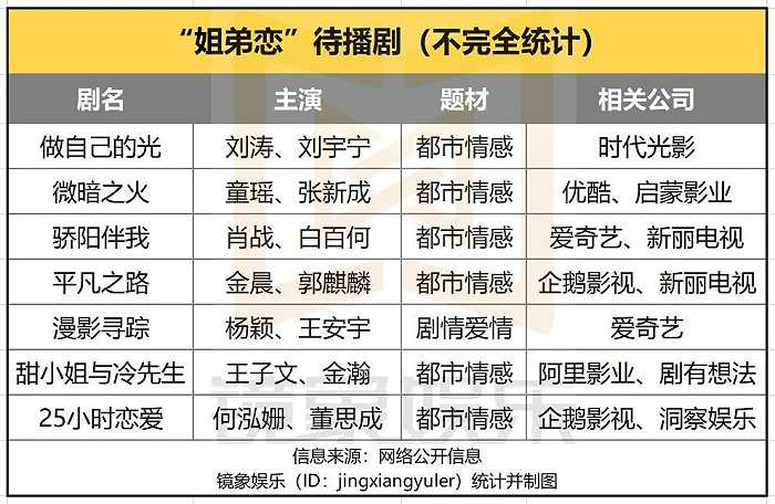 事实上,近两年关于“姐弟恋”的剧集如雨后春笋,早一些的《下一站是幸福》,后来的《炽道》《去有风的地方》等都是此类内容。而在待播剧中,《做自己的光》《微暗之火》《骄阳伴我》等进入排播周期,相关的内容布局还在继续,不知不觉中,“姐弟恋”已然成了剧集市场新的流量密码。