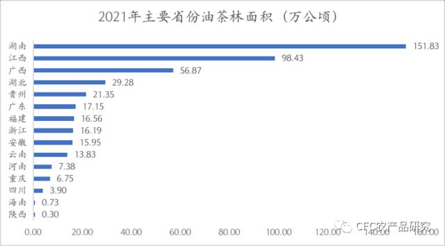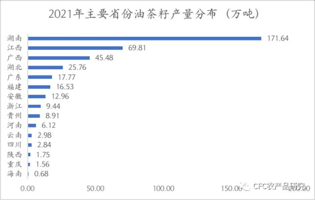 目前,我国油茶林集中分布在湖南、江西、广西、浙江、福建、广东、湖北、贵州、安徽、云南、重庆、河南、四川和陕西14个省(区、市)的642个县(市、区)。其中湖南省油茶籽产量最高,2021年产量为为171.64万吨,位于第二的江西省产量69.81万吨,与油茶种植面积匹配。