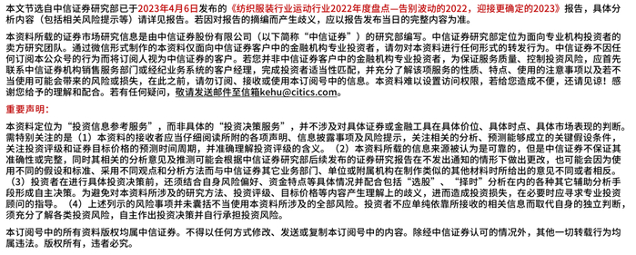 在局部疫情超预期,宏观经济与消费环境不确定性提升的2022年,各大国产运动品牌仍体现了强大的经营韧性。展望2023年,我们在核心指标向上的基础上,仍将期待边际改善与复苏。首先,2022年疫情超预期扰动带来的各大品牌流水与折扣低基数;其次,国产品牌如李宁、特步仍具备净开店空间,合作头部经销商进入优质点位为2023年奠定基础;运动仍是最具备必选属性的可选消费,需求韧性仍在。从1年维度和更长期维度看,运动仍是兼具高景气和清晰格局的优质消费赛道。目前短期股价有所回调,龙头估值逐渐回归合理。