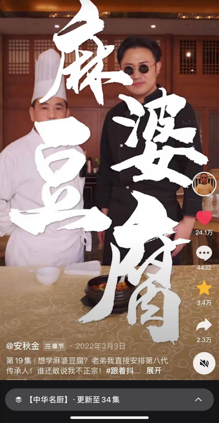拍到现在,“中华名厨”系列已经有3.5亿播放量。很多大厨平日里比较严肃正经,但在搞怪调皮的安秋金的感染下,他们在视频里有时也变得“不正经”。可能也正是这种反差感,安秋金拉近了名厨们和普通人的距离。