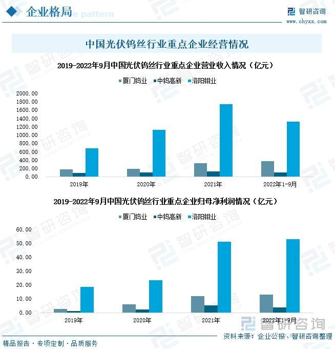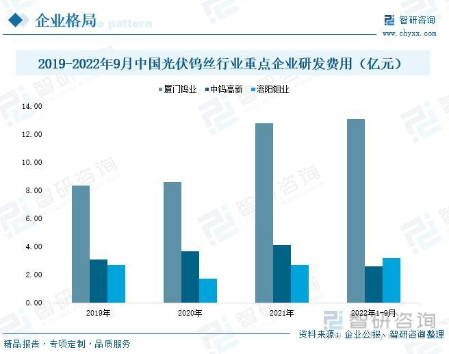 随着光伏钨丝行业市场热度提升,厦门钨业、中钨高新、洛阳钼业、三超新材、岱勒新材、恒星科技等企业加速该领域技术研发及产能布局,成为我国光伏钨丝产业市场重点关注企业。2022年1-9月,厦门钨业、中钨高新、洛阳钼业营业收入分别为369.16亿元、99.71亿元、1324.69亿元;同比变化率分别为66.5%、2.91%、4.67%;归属于上市公司股东的净利润分别为13.06亿元、3.99亿元、53.06亿元,同比变化率分别为31.27%、0.25%、49.12%;研发投入金额分别为13.06亿元、2.61亿元、3.17亿元,同比变化率分别为57.52%、0.83%、183.29%。厦门钨业、中钨高新、洛阳钼业三家企业业务经营情况持续向好,同时为改善产品性能,提升产品生产合格率,保障企业市场竞争力,企业产品技术研发力度不断增强,研发投入金额不断增加。