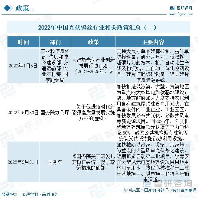 《智能光伏产业创新发展行动计划(2021-2025年)》《关于促进光伏产业链健康发展有关事项的通知》等政策表明对光伏硅片切割耗材进行技术迭代升级成为市场必然发展趋势,钨丝金刚线替代发展势不可挡;此外,《关于促进新时代新能源高质量发展实施方案的通知》《国务院关于支持山东深化新旧动能转换推动绿色低碳高质量发展的意见》等系列政策表明光伏产业已成为推动我国能源结构调整的重点产业之一,将持续为我国光伏钨丝产业发展提供动力。