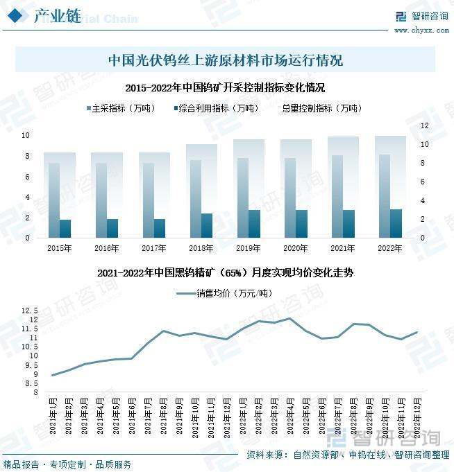 我国现拥有江西景德镇浮梁县朱溪钨铜矿和九江武宁县大湖塘钨矿两个世界排名靠前的钨矿,钨矿资源总储量达400万吨以上,占世界总储量的66.66%。为防止过度开采及重要的钨产品被贱卖,我国实行钨矿资源开采总指标控制原则,即由国家部门统一规划分配各地钨矿资源开采指标。2022年,全国钨精矿(三氧化钨含量65%)开采总量指标是109000吨,其中主采指标81170吨,综合利用指标27830吨,总量指标同比增幅仅0.93%。2015-2022年,我国钨资源年开采产量增幅不高,产业市场整体呈现供不应求态势,市场钨制品价格持续上涨,成本影响持续传递至终端市场。如黑钨精矿(65%)的市场销售均价从2021年1月的8.92万元/吨一路上涨至2022年12月的11.31元/吨,期间,2022年4月其市场销售均价峰值上升达到12.07元/吨。
