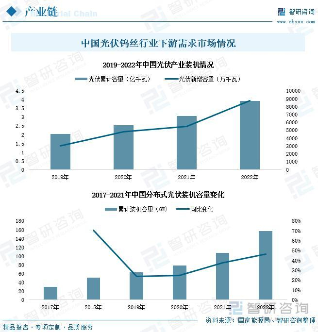 2022年,我国光伏新增装机容量为8741万千瓦,产业累计装机容量达3.93亿千瓦,其中分布式光伏装机容量达157.62GW,同比增长46.61%;光伏产业装机容量的增加持续拉动我国光伏硅片切割需求增长至325GW,国内光伏钨丝市场渗透率提升达8%左右,光伏钨丝行业需求市场空间达4.66亿元。