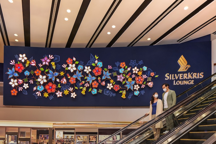 在颜值经济加速升温的当下,越来越多的机场休息室将新潮设计理念、地域人文特色和自身品牌元素相糅合,以期征服旅客越来越挑剔的审美。在新加坡樟宜机场新航SilverKris银刃贵宾休息室门口,放置着一个宽12米,高3.8米,以新航蜡染印花为主题所设计的高雅艺术玻璃装饰。这一装饰由现旅居新加坡的澳大利亚玻璃艺术家B.Jane Cowie设计,由105件手工制作的艺术玻璃作品组成。