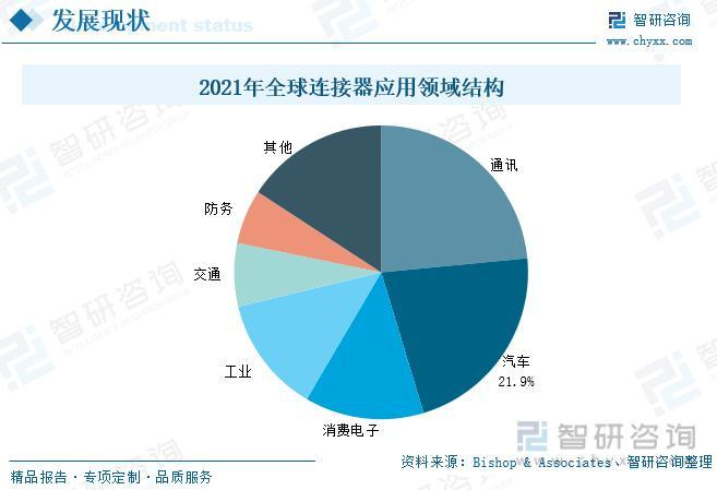 从下游应用领域分布来看,连接器已成为许多行业不可或缺的零部件。在通讯、汽车、工业等领域,均可见到连接器的身影。其中通讯与汽车为连接器主要应用领域,2021年全球23.5%的连接器应用于通讯产业,汽车产业占比21.9%,仅次于通讯领域。