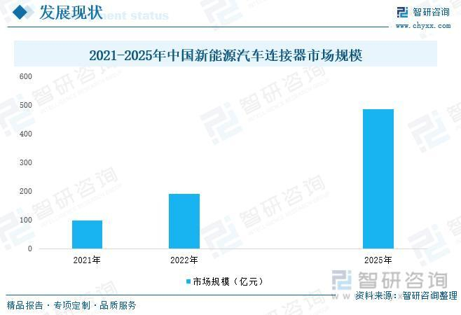 数据显示:2021年我国新能源汽车连接器市场规模约为98亿元,占汽车连接器总规模的15%左右,2022年我国新能源汽车连接器市场规模接近200亿元。未来新能源汽车将进一步替代燃油车,渗透率也将继续提升,有望带动新能源汽车连接器市场规模继续扩大,2025年市场规模将超480亿元。