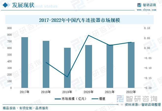 2018-2019年受汽车产量下滑影响,我国汽车连接器市场规模也有所萎缩,2020年以来,受益于新能源汽车产销量的增长,汽车连接器市场规模也不断增加,2021年我国汽车连接器市场规模达653亿元,同比增长1.4%,2022年我国汽车连接器市场规模将进一步扩张,有望超690亿元。