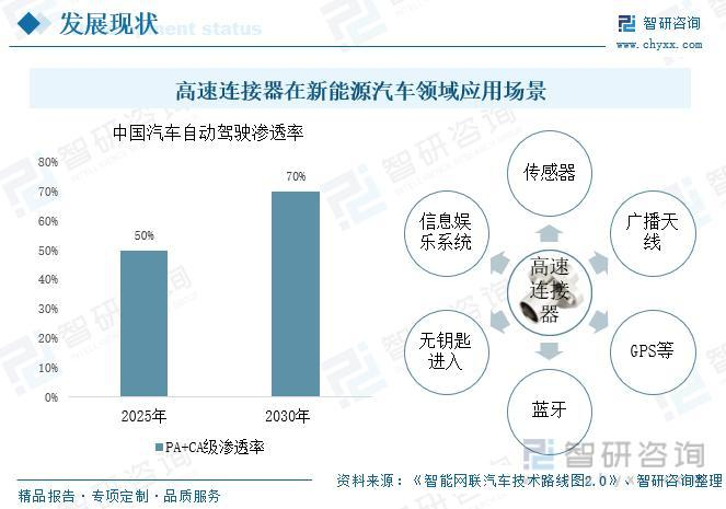 高速连接器则主要受益于汽车智能化趋势,近年来在汽车电动化转型较为成功的背景下,新能源汽车作为智能化最佳载体,以电动化为基础的智能化竞争成为车企技术比拼的关键,政府不断完善自动驾驶相关法律法规,各车企纷纷加大智能汽车的研发力度,智能座舱配置日益丰富,自动驾驶有望加速商业化落地,根据《智能网联汽车技术路线图2.0》数据:到2025年,我国PA(L2部分自动驾驶)、CA(L3有条件自动驾驶)级智能网联汽渗透率超过50%,2030年渗透率将超70%。智能汽车搭载了毫米波雷达、激光雷达等多个传感器,与ADAS控制模块、雷达控制模块等多个模块,对数据传输速度、传输量及可靠性要求更高,催生了高速连接器需求。高速连接器长用于传感器、GPS、无钥匙进入、信息娱乐系统、导航与驾驶辅助系统等。