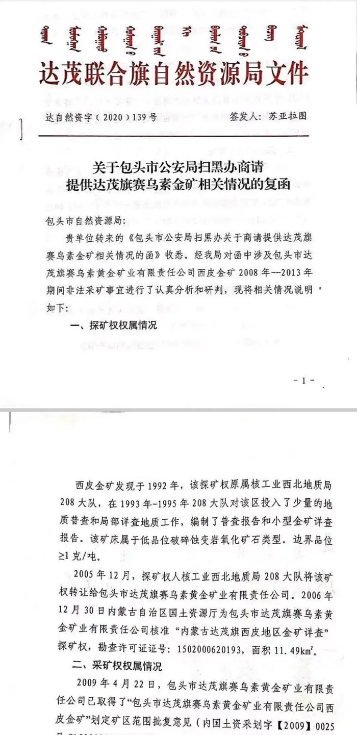 对这个“政府允许”的说法,达茂旗自然资源局在《复函》中表示:“2008年至2010年间,全旗当时的基本政策是以‘工业立旗’为主导思想,鼓励政府招商引资项目或持有探矿证等相关手续的企业开采生产。赛乌素金矿西皮采区就是在这样的政策环境下开始生产建设的。因此,该矿可视为边批边建项目。”
