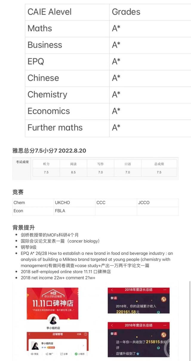 除了帝国理工学院,李骐辰目前还拿到了伦敦大学学院offer,李骐辰向记者分享了她的成绩单:数学、高数、化学、经济、商务、中文、EPQ都是A*,雅思总分7.5(小分全部在7分以上),面对这样优异的成绩,李骐辰却显得格外淡定。