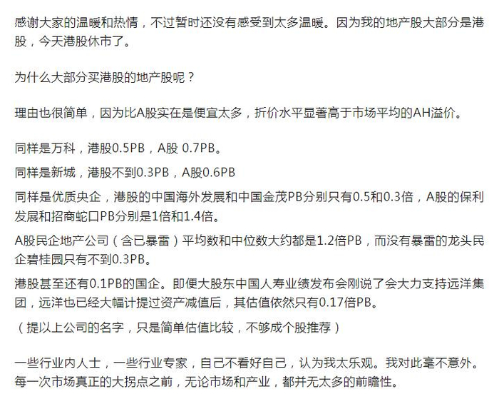 今日,半夏投资李蓓发文表示,我(买)的地产股大部分是港股。至于为什么大部分买港股的地产股?她表示,理由很简单,“因为比A股实在是便宜太多,折价水平显著高于市场平均的AH溢价。”