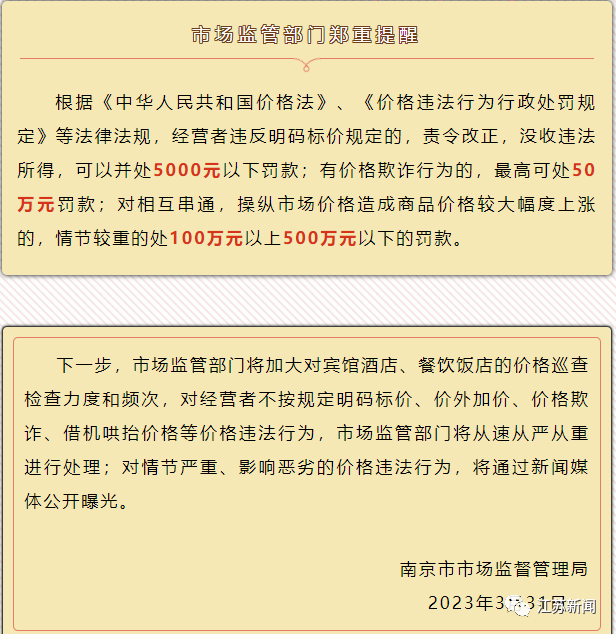 记者了解到,南京市场监管部门面向宾馆酒店、餐饮饭店经营者发布了价格政策提醒函,其中特别强调了明码标价,规范经营。宾馆酒店、餐饮饭店经营者要严格落实明码标价制度,价格公示要真实准确、标识醒目,价格变动要及时调整,不得在标价之外加价出售商品或提供服务,不得收取任何未予标明的费用。