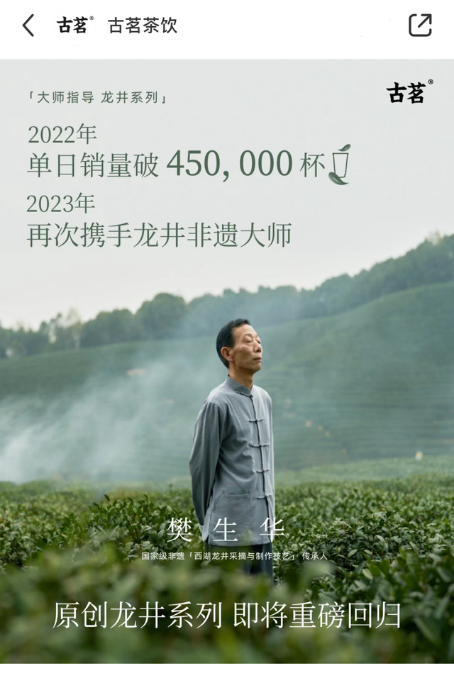 3月17日,古茗官宣“原创龙井系列”即将重磅回归。据品牌方介绍,此系列去年首次邀请了非遗大师樊生华为首席导师,今年再次携手大师。新品于4月3日已推出。