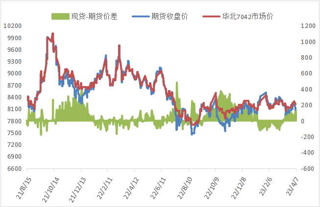 线性现货市场价格大稳小动,华北市场报价8250-8300,尾盘止跌反弹,现货升水05合约盘面97左右,基差略走弱。