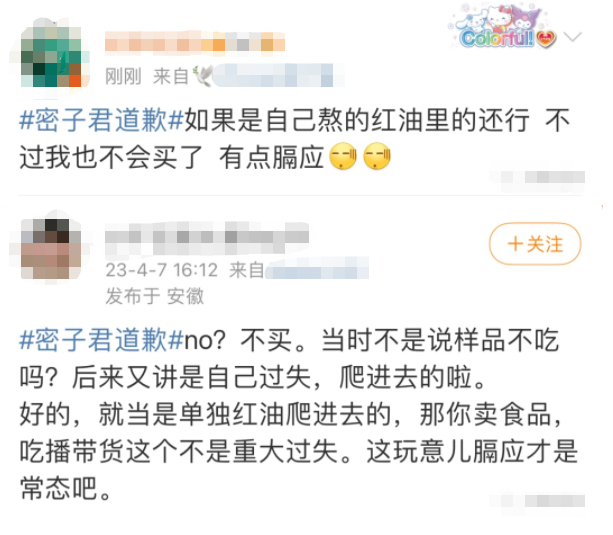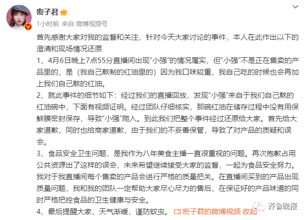 “到此我们把整个事件经过还原给大家。首先给大家道歉,同时也给商家道歉,由于我们的不妥善保管,导致了对产品的质疑和误会。”