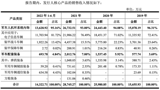 公司主要产品按照应用场景划分为军用车辆人机环系统内饰、弹药装备、军用车辆辅助装备、军用车辆通信装备。此外也已向军用复合材料运输方舱、数据方舱等领域拓展。