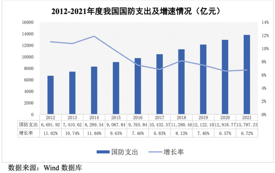 近十年我国国防支出一直保持适度稳定增长,2012年国防支出仅6,691.92亿元,2017年首次超过1万亿元大关,达到10,432.37亿元,2021年已达到13,787.23亿元。