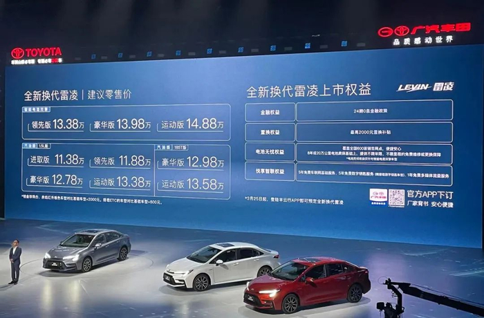 3月23日,广汽丰田新款雷凌正式上市,共推出6款汽油版车型,售价区间11.38-13.58万元,3款油电混合的双擎版车型,售价区间13.38~14.88万元。