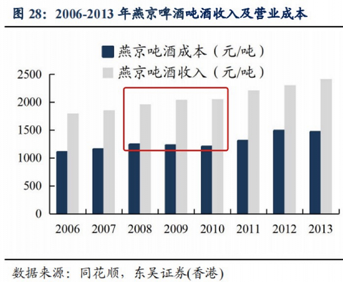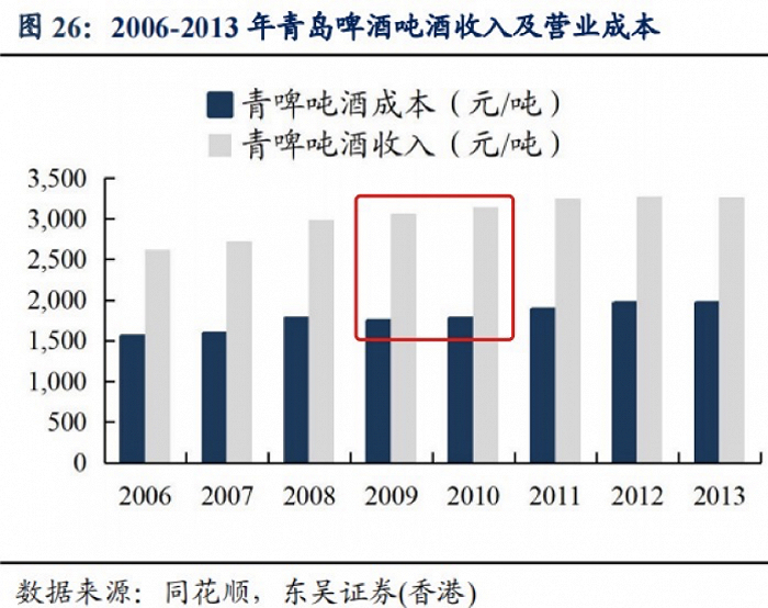 以青岛啤酒为例,在2008年之后的两年内,每吨啤酒成本稳定后,收入也在提升。